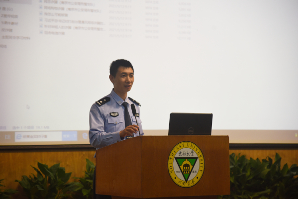 本次讲座特邀南京市公安局江北新区分局泰山新村派出所陆建兵警官主讲,他防范电信网络诈骗、共建和谐平安校园”为主题首先介绍了电信网络诈骗与传统诈骗的区别和高校电信网络诈骗案件的形势,随后结合其丰富的工作经验和常见的真实案例,以生动的文字和视频资料展开本次宣讲。陆警官着重向在场师生介绍了八种常见的校园电信网络诈骗类型,详细阐述了各种诈骗类型的具体特征,揭露骗局背后的真相。最后,陆警官针对常见的电信网络诈骗提供了针对性的防范方法,得到了在场师生的一致好评。