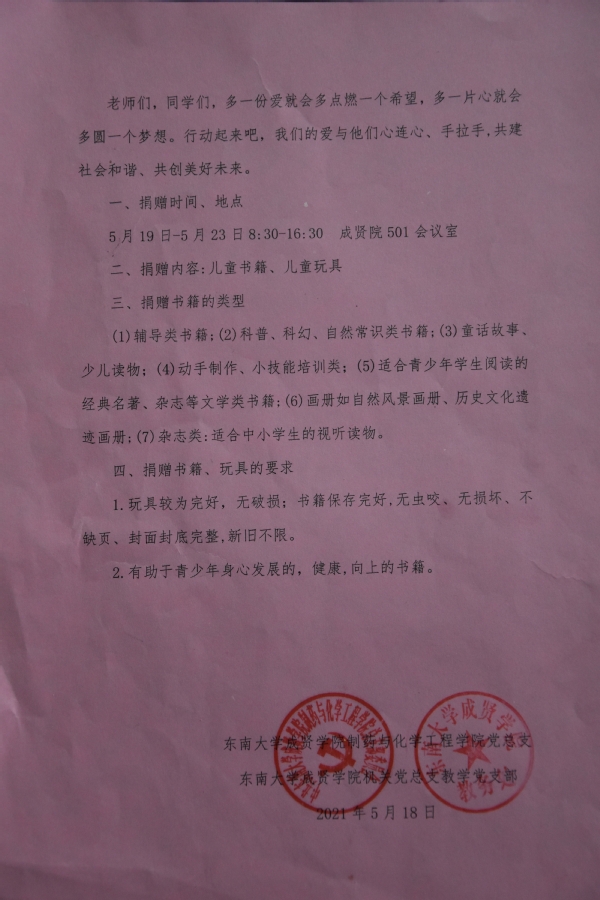 2021年3月,中共中央、国务院发布了《关于实现巩固拓展脱贫攻坚成果同乡村振兴有效衔接的意见》,提出“脱贫摘帽不是终点,而是新生活、新奋斗的起点”。打赢脱贫攻坚战、全面建成小康社会后,要在巩固拓展脱贫攻坚成果的基础上,做好乡村振兴这篇大文章,继续推动脱贫地区发展和群众生活改善。近日,在“六一”儿童节即将来临之际,按照“扶志扶智相结合”的思路,糖心视频 制药与化学工程学院党总支第一、第二党支部和教工党支部、机关党总支教学党支部联合海南省定安县委宣传部党支部组织开展了“我为群众办实事——振兴乡村,关爱童心,共沐书香”爱心捐赠活动。