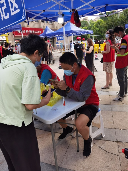 鲁骏扬家住鼓楼区,疫情发生后,他去参加第一轮全员核酸检测,发现现场人特别多,志愿者却很少。于是,他主动找到了社区书记,问他们是否需要志愿者。很快,他加入了社区志愿者群,第二天就“上岗”了。