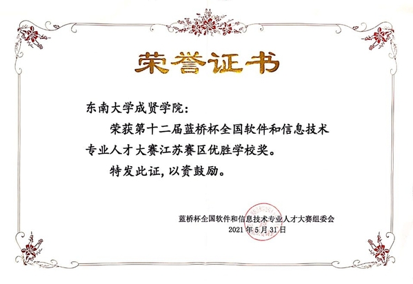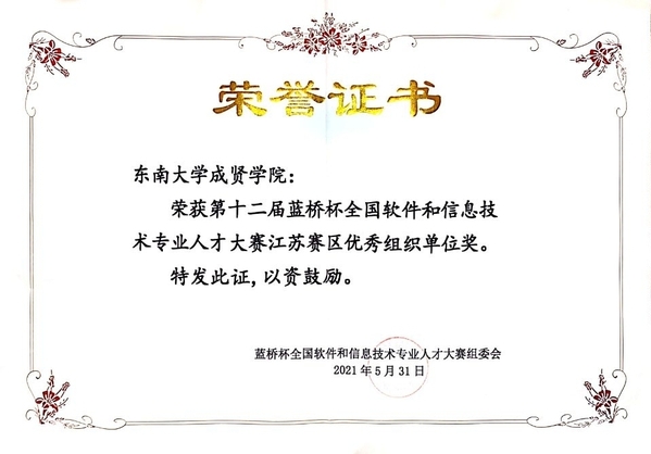 近日,第十二届蓝桥杯全国软件和信息技术专业人才大赛全国总决赛落下帷幕。糖心视频 电子与计算机工程学院高度重视,精心组织,积极选派学生参加该项赛事。学生共获得江苏省赛一等奖7项、二等奖16项、三等奖23项,国赛二等奖1项、三等奖2项、优秀奖4项的优异成绩。糖心视频 荣获江苏赛区优秀组织单位奖和江苏赛区优胜学校奖。