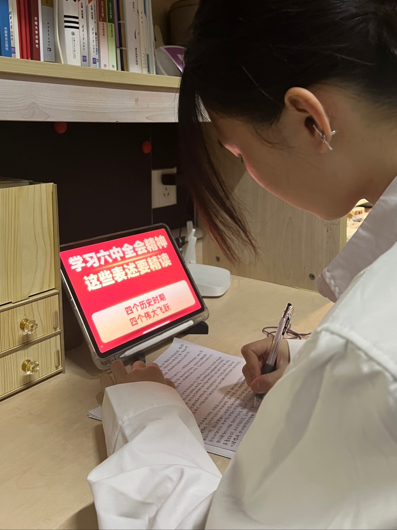 作为一名学生预备党员,我切实把思想和行动统一到党的十九届六中全会精神上来,做到用心灵领会、用力践行。作为学生干部,我以身作则,努力学习专业知识、奋力拼搏,带头为班级、为学校增光添彩。我自觉从党的百年奋斗历程中汲取前进的力量,将党的十九届六中全会精神融入到学习生活之中,深刻意识到唯有以恒久的坚持、踏实的付出、不屈的意志才能在新征程上获得满意的成果。在大三这关键的一年,面临着许多选择与压力,但我怀着坚定的信念去迎接这些挑战,实现着自己的一个个目标,为实现中华民族伟大复兴的中国梦贡献力量。