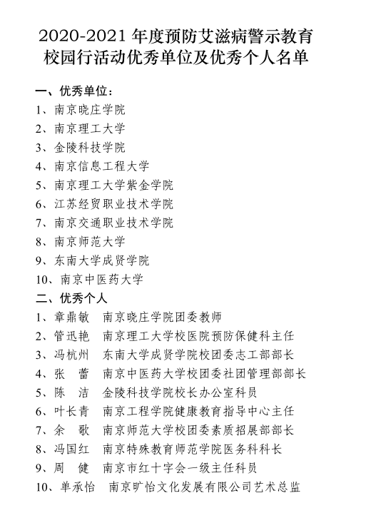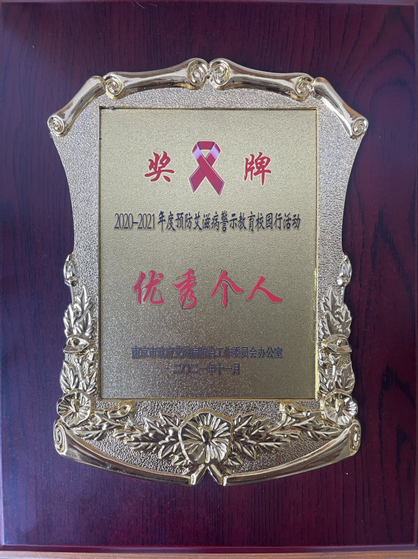 11月30日,在第34个“世界艾滋病日”到来之际,糖心视频 在南京市政府艾滋病防治工作委员会组织的预防艾滋病警示教育校园行活动中荣获优秀单位,冯杭州老师荣获优秀个人。