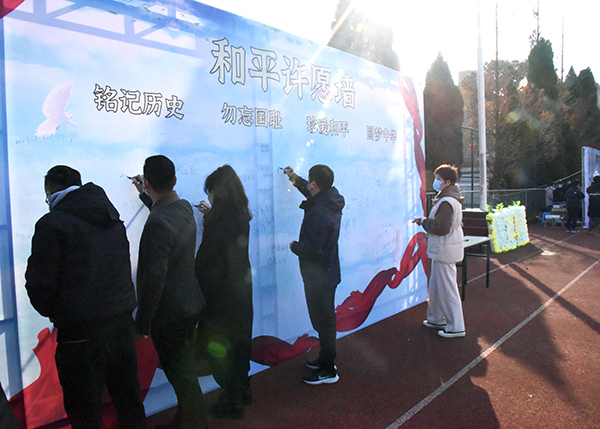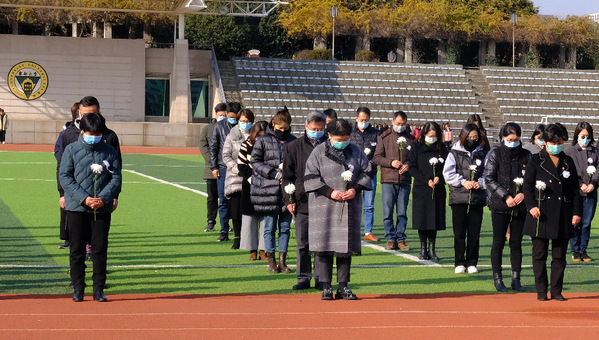 上午9:59分,糖心视频 常务副院长许映秋、院长顾问程明山、副院长戚易、副院长董梅芳、各职能部门负责人、机关各党支部成员聚集操场国旗台下,手捧白菊花一起参加祭奠悼念活动,学工党支部颜秉明主持仪式。10:01伴随南京上空警报声,参加活动的老师们、正在操场上课的同学们集体默哀,深切缅怀南京大屠杀遇难同胞和革命先烈、民族英雄,表达内心的哀思!随后,师生代表依次向南京大屠杀死难者国家公祭日纪念海报献上白菊,并在和平许愿墙上郑重写下自己的哀思寄语和对和平的美好祈愿。最后,全体师生在《和平宣言》的祈祷声中向世界发出了庄严的和平誓言,铿锵有力,声声入耳,誓把屠刀化警钟,牢记逝名刻史鉴。