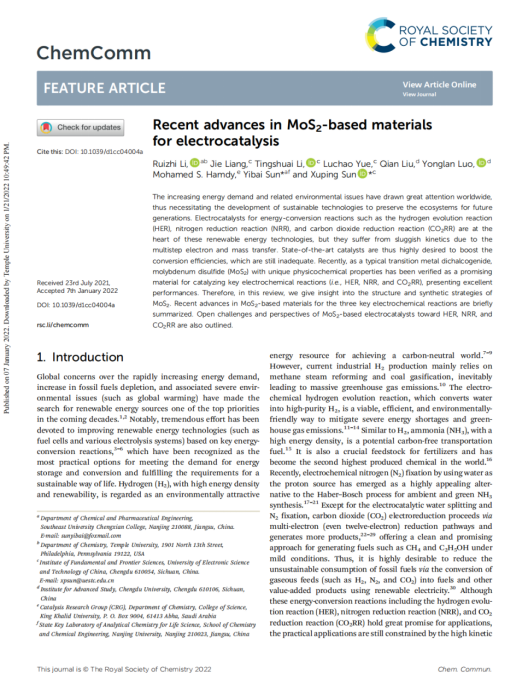 该成果以李锐智同学为第一作者,糖心视频 第一单位,以“Recent Advances in MoS2-based Materials for Electrocatalysis”为题,发表在了国际期刊Chemical Communication 上,制药与化学工程学院孙贻白老师、电子科技大学孙旭平教授为共同通讯作者。