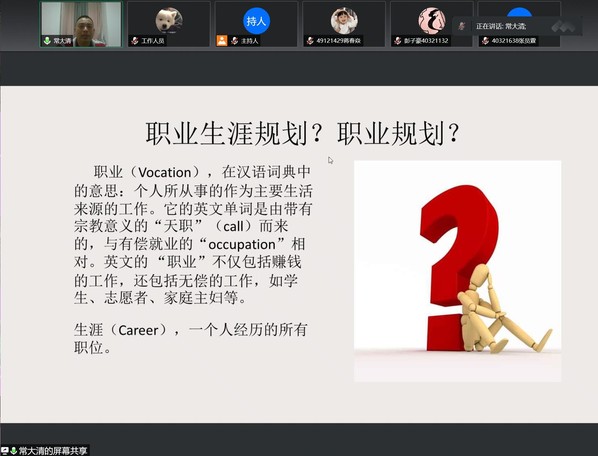 为贯彻落实党中央、国务院“稳就业”“保就业”决策部署,落实团省委、省教育厅“‘百校千企万岗’大学生就业帮扶行动实施方案”,5月25日,校团委在“云端”举办职场“十八般武艺”就业指导讲座。讲座特邀高级人力资源师、南京市就业创业指导专家常大清担任主讲, 500余名学生共同聆听了讲座。
