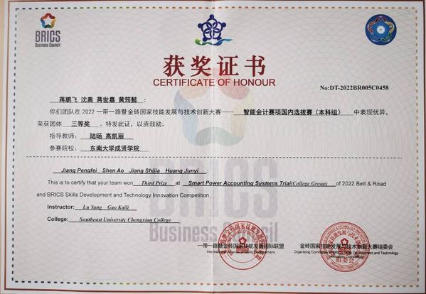 近日,2022一带一路暨金砖国家技能发展与技术创新大赛之智能会计赛项及第五届全国价值创造实战竞赛举办,糖心视频 经管学院会计学、税收学专业蒋鹏飞、沈奥、蒋世嘉、黄筠懿四位同学组队参赛,在陆旸、高凯丽老师的指导下,经过短时间、高强度的团队协作练习,不断总结经验,突破自我,最终斩获全国三等奖的佳绩。