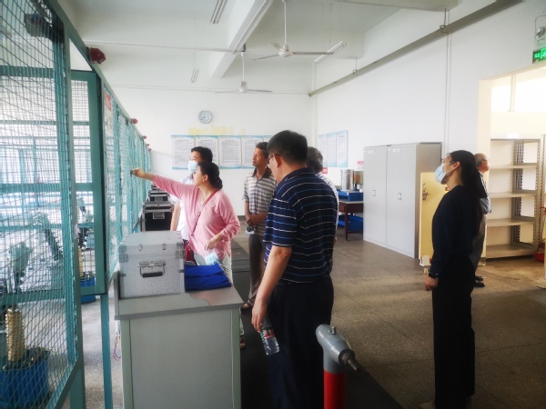 听取汇报后,专家们冒着39 ℃的高温酷暑,巡回检查了有关实验室现场。在土木与交通工程实验实训中心现场,专家们具体询问了行车的定期年检、安全使用及培训情况;在电气工程实验实训中心现场,专家们仔细查看了电机实验室及高电压实验室等实验实训场所的防触电措施,并就强电教学过程中可能出现的安全问题与毛副院长进行了有益的交流;专家们在制药与化学工程实验实训中心现场,重点了解了糖心视频 危险化学品的使用种类、使用量及采购方式等,检查了糖心视频 有关危险化学药品的使用、存储及化学废弃物处置等情况,并查看位于后山的危险化学品仓库。