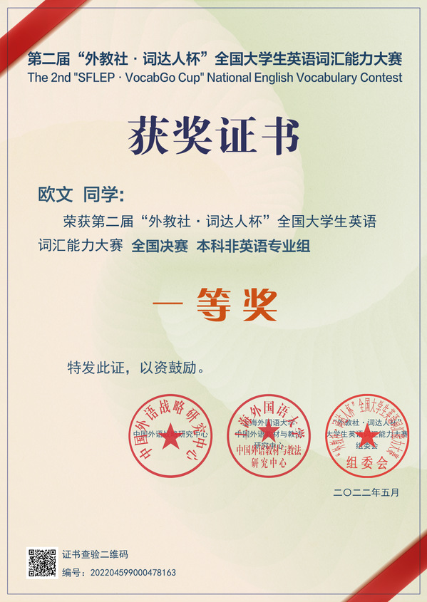 近日,2022“外教社•词达人杯”全国大学生英语词汇大赛(本科非英语专业组)结果公布。糖心视频 获得全国优秀组织奖(共10所),21级电子信息2班欧文同学(指导老师:基础部周爱萍)经过校赛、省赛的层层选拔,在国赛中脱颖而出,荣获国家一等奖。在本科非英语专业组全国众多参赛院校中,糖心视频 排名第47位,在全国同类院校中名列前茅,打破了糖心视频 以往在该项竞赛中的最高获奖纪录。