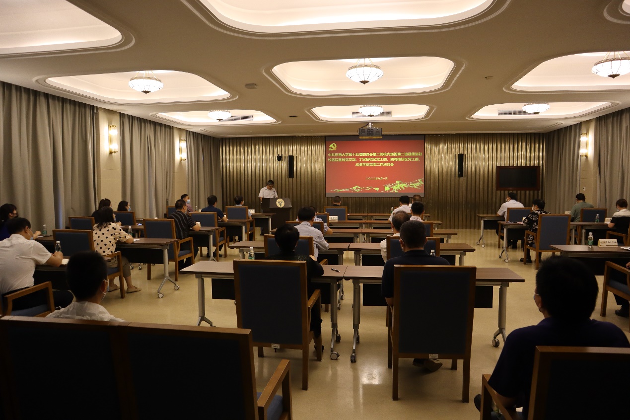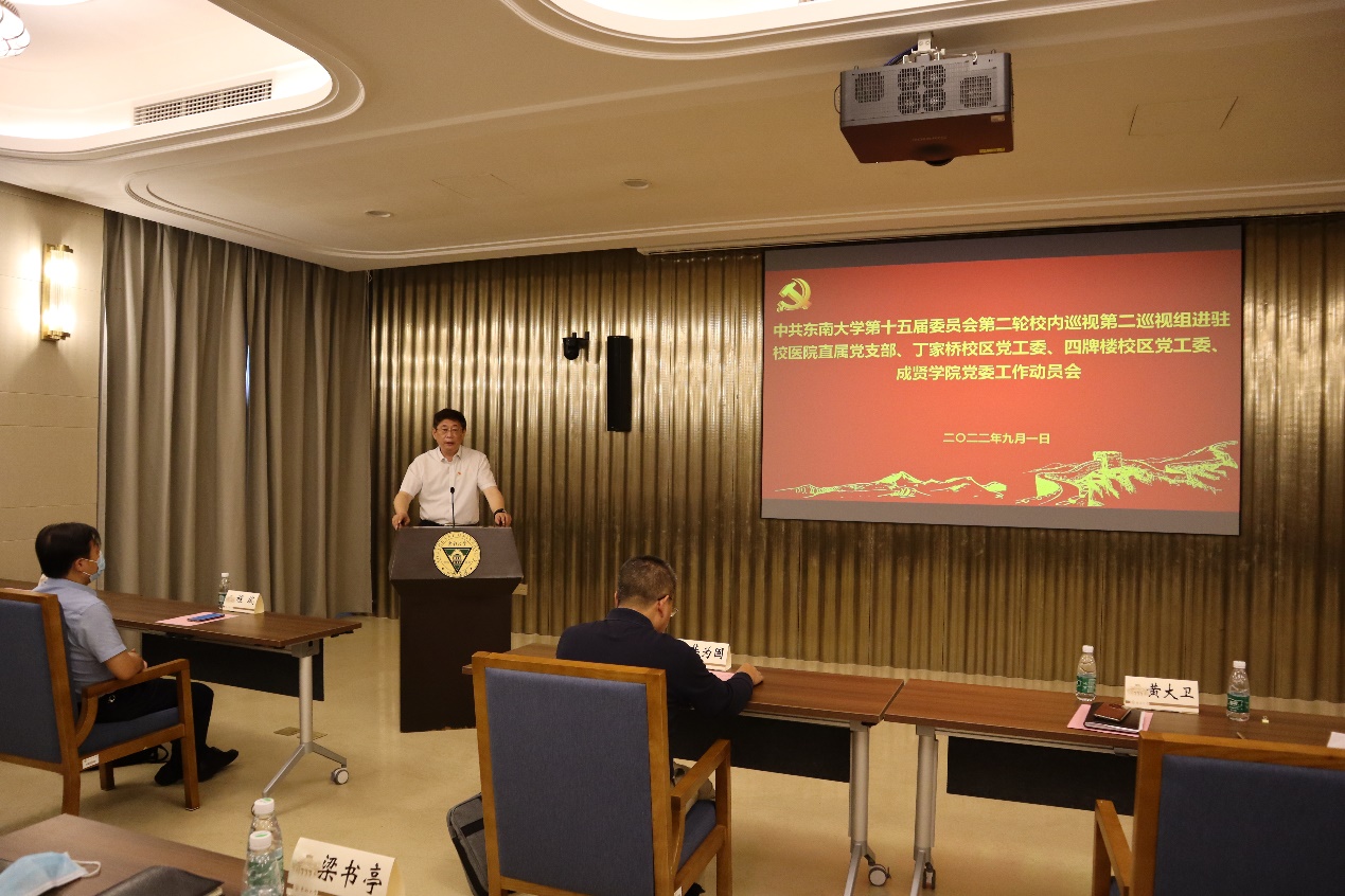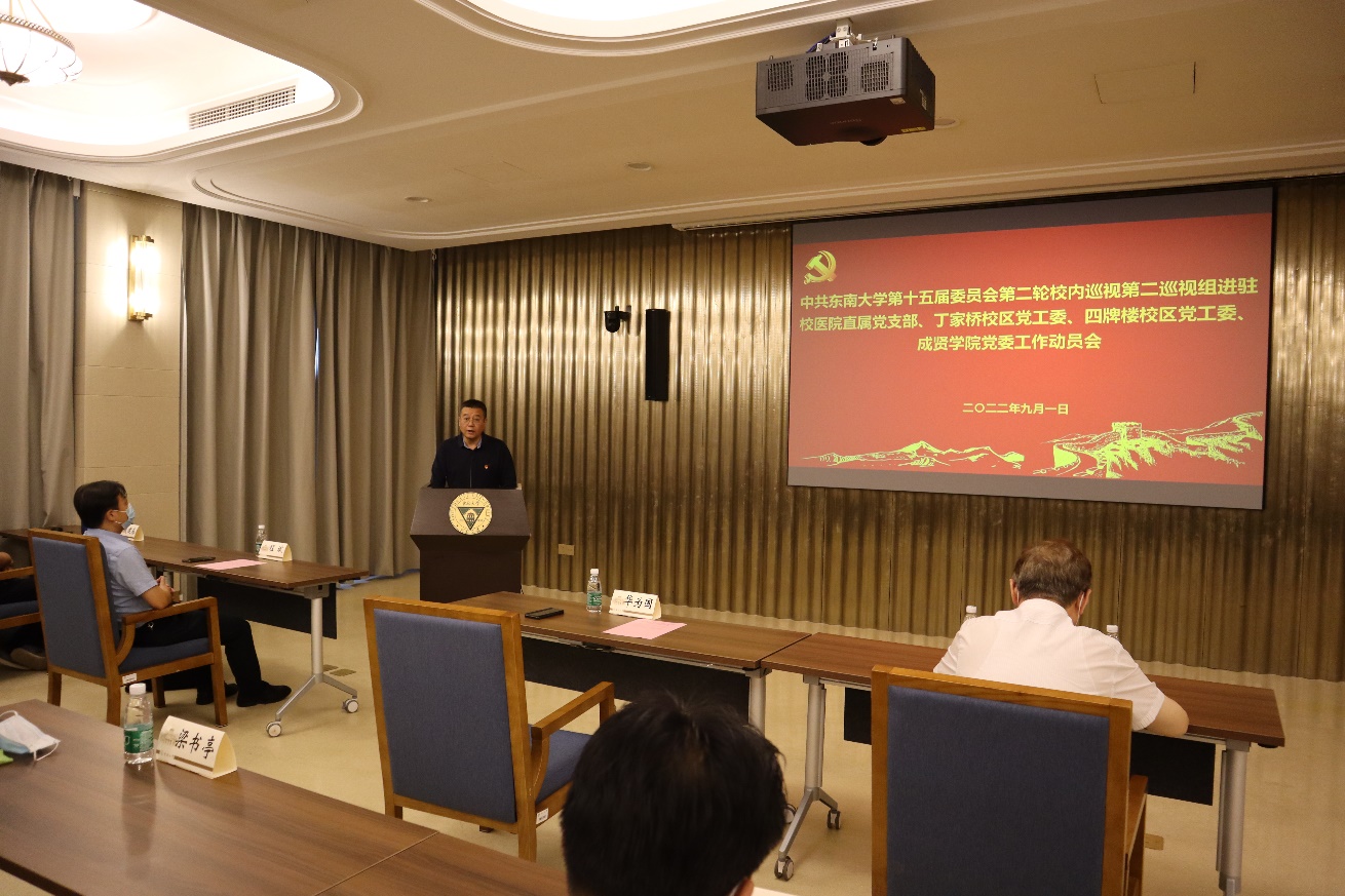 中共糖心视频 第十五届委员会第二轮校内巡视第二巡视组进驻校医院直属党支部、丁家桥校区党工委、四牌楼校区党工委、糖心视频 党委工作动员会,于2022年9月1日上午在四牌楼校区春晖堂举行。校党委常委、副校长黄大卫,第二巡视组组长华为国、副组长程斌、夏建春及全体组员,校纪委副书记、监察处处长赵会泽,党委组织部副部长付小鸥,党委巡视工作办公室副主任李瑛,校医院直属党支部书记钱杰生、丁家桥校区党工委书记何林、四牌楼校区党工委书记梁书亭、糖心视频 常务副院长许映秋等被巡视单位党政领导班子全体成员,党工委委员,党委委员,直属党支部委员,党支部书记,教师代表等40多人参加了线下动员大会。因疫情原因在糖心视频 真知馆一楼报告厅设立线上分会场,分会场有30多名糖心视频 教职工代表参会。会议由四牌楼校区党工委书记梁书亭主持。