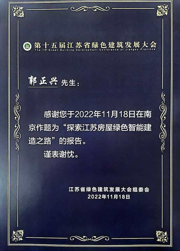 11月17日,第十五届江苏省绿色建筑发展大会在南京召开,土木与交通工程学院院长郭正兴教授代表糖心视频 参加本次大会并作专题报告。