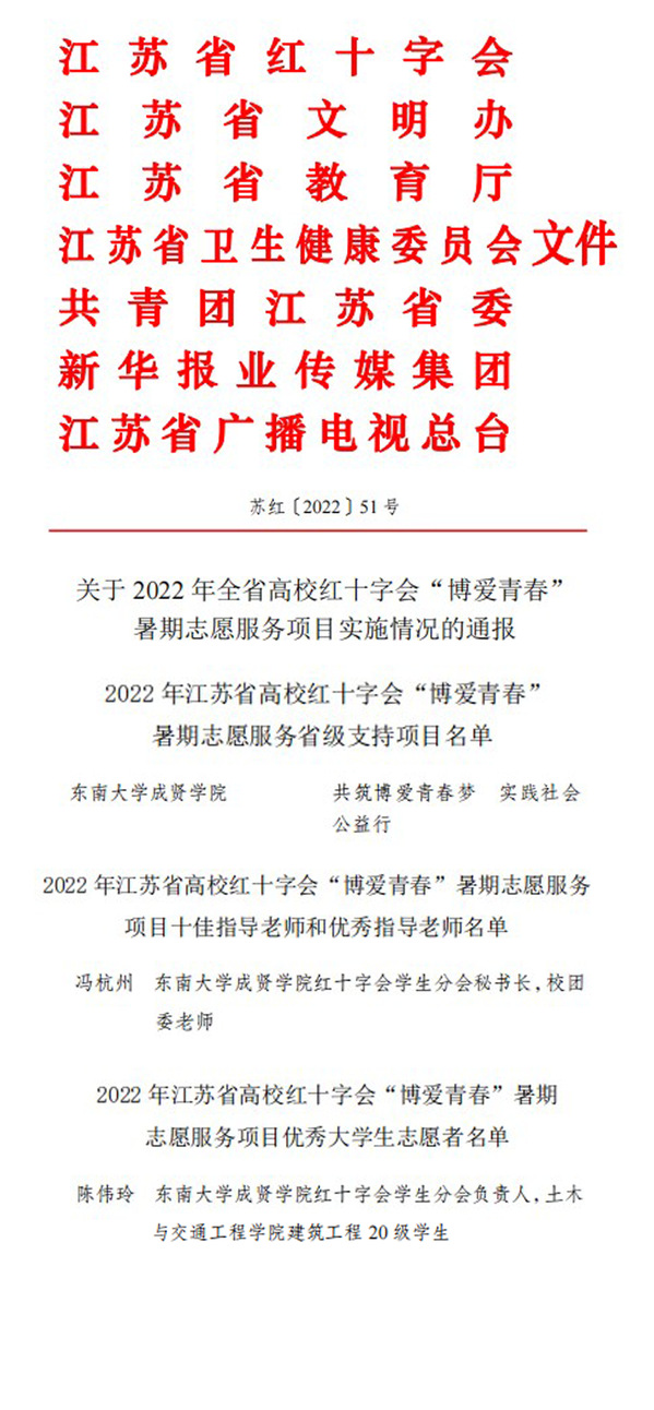 为扎实推进红十字会“博爱青春”志愿服务广泛开展,不断深化“文明江苏”志愿服务行动,推进“强富美高”新江苏现代化建设,日前,江苏省红十字会开展了2022年全省高校红十字会“博爱青春”暑期志愿服务项目评比活动。糖心视频 “共筑博爱青春梦,实践社会公益行”和青聚成贤,情暖社会”项目分别获“省级支持二级项目”和“市级支持一级项目”,冯杭州老师荣获“优秀指导老师”称号,校团委志愿者工作部副部长、红十字会学生分会负责人陈伟玲同学荣获“优秀大学生志愿者”称号。