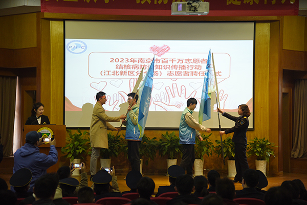 由国家卫健委、中国疾病预防控制中心、中国健康教育中心联合发起的“百千万志愿者结核病防治知识传播行动”已开展多年,江北新区公共卫生服务中心的结核病防治工作者代表吴玉蕾医师在会场宣读志愿者倡议。在现场授旗仪式环节,南京市卫生监督所学校卫生监督科科长戴心声、江北新区公共卫生服务中心项目管理科科长洪镭为糖心视频 志愿者代表授旗,糖心视频 志愿者将和其他高校志愿者携手并肩,将结核病防治知识的传播行动和志愿者公益精神持续进行下去。