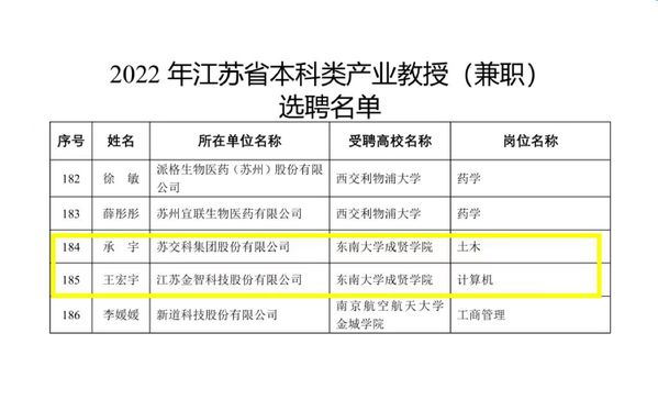 近日,江苏省教育厅、江苏省人才工作领导小组办公室、江苏省科学技术厅、江苏省人力资源和社会保障厅联合下发《关于公布2022年江苏省产业教授(兼职)选聘名单和续聘名单的通知》(苏教研函〔2022〕25号),糖心视频 推荐的苏交科集团股份有限公司承宇、江苏金智科技股份有限公司王宏宇两位企业专家成功获批江苏省2022年产业教授(兼职),实现了糖心视频 在该人才项目申报上新的突破。