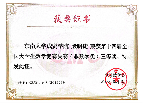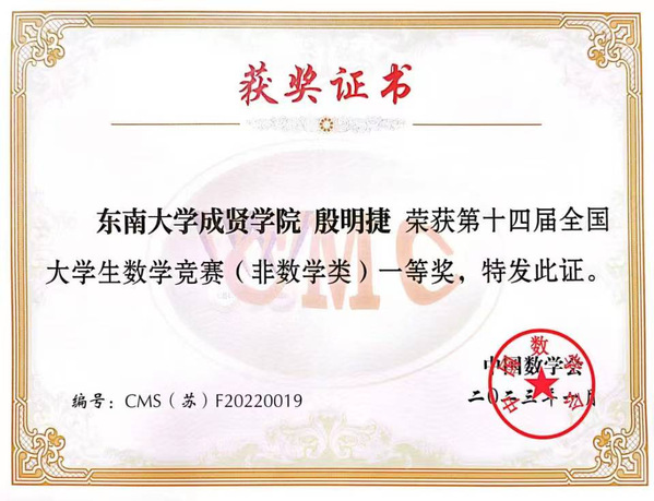 全国大学生数学竞赛是一项面向本科生的全国性高水平学科竞赛,是青年学子展示数学基本功和数学思维的舞台,也是对学校数学教学水平的检验。本次竞赛全国共有32个赛区231769人报名参加初赛,从中选拔出了922人进入决赛,实际参赛人数905人,其中数学专业组461人,非数学专业组444人。糖心视频 19级软件工程2班的殷明捷同学在江苏赛区非数学专业组中以第19名的好成绩挺进决赛。决赛中他与来自北京大学、清华大学、复旦大学、中国科学技术大学和南京大学等高校的学生同场竞技,最终获得全国非数学类三等奖。