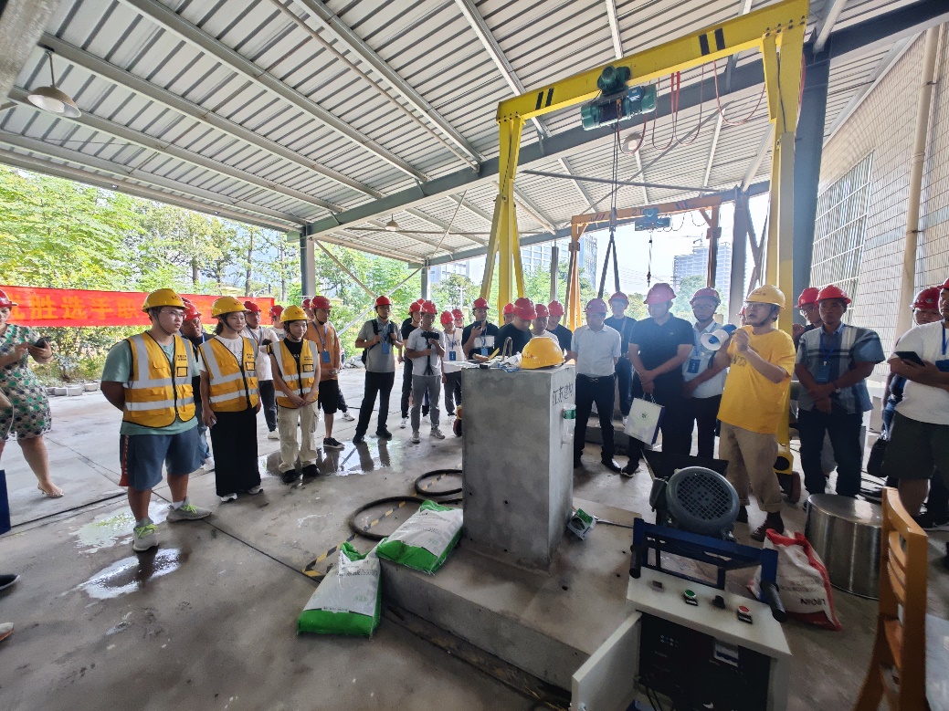 学生参与观摩学习预制柱灌浆作业