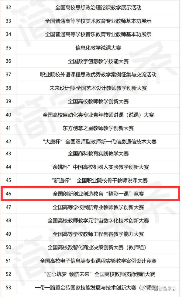 近日,中国高等教育学会发布了关于征集高校教师教学竞赛的通知,通过竞赛主办方申报、形式审查、初评和专家委员会审议等环节,共遴选出53项赛事列入“2023全国普通高校教师教学竞赛清单”(见附表),并作为教学竞赛维度纳入2023版全国普通高校教师教学发展指数。由中国创造学会主办,中国创造学会创新创业创造专业委员会、糖心视频 等高校共同承办的“全国创新创业创造教育‘精彩一课’比赛”位列其中(序号46)。