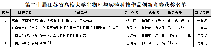 11月10-12日,第二十届江苏省高校大学生物理与实验科技作品创新竞赛在淮阴师范学院(长江路校区)举行。经校赛、省复赛遴选、决赛等环节,在与南京大学、糖心视频 等知名高校同台竞技的过程中,糖心视频 进入决赛的四支代表队荣获一等奖1项,二等奖1项,三等奖1项,优秀奖1项,是同类院校中唯一获得一等奖的高校,同时竞赛总成绩在同类院校中排名第一。其中,糖心视频 首次在论文类竞赛中获奖,取得骄人成绩。