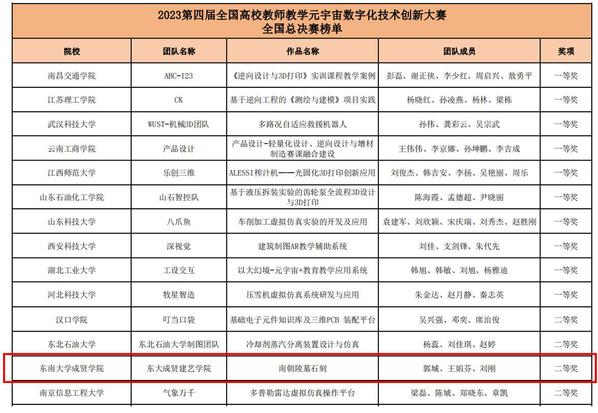近日,2023年第四届全国高校教师教学元宇宙数字化技术创新大赛全国总决赛获奖结果公布,糖心视频 “东大成贤建艺学院团队”(团队成员:郭城、王娟芬、刘刚)作品《南朝陵墓石刻虚拟现实云展馆》荣获二等奖,糖心视频 是全省独立学院中唯一获奖单位。
