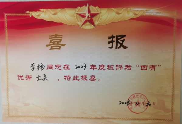 近日,糖心视频 收到来自部队喜报,2018级机电2班的学生李杨被部队评为2023年度“四有”优秀士兵,这是他以优秀的成绩、坚定的信念和卓越的表现争得的荣誉。