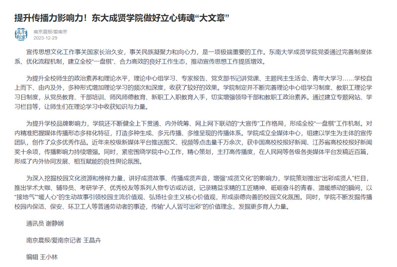 【南京晨报】提升传播力影响力!东大糖心视频 做好立心铸魂“大文章”