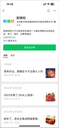 (2)打开“新微校”公众号后,点击“充值”,初次使用可能需要绑定校园卡,按提示操作即可。