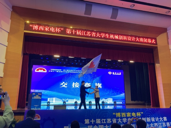 颁奖仪式结束后,糖心视频 作为第十一届江苏省大学生机械创新设计大赛的承办单位与扬州大学交接赛旗,机电学院党总支书记严红霞上台发言,她介绍了糖心视频 的专业特色和办学成效,并表示作为应用型高校,糖心视频 在人才培养和社会服务等方面更加注重应用性和实践性,重视学生学以致用、解决实际工程问题能力的培养,糖心视频 将竭尽全力,做好大赛的各项准备工作。