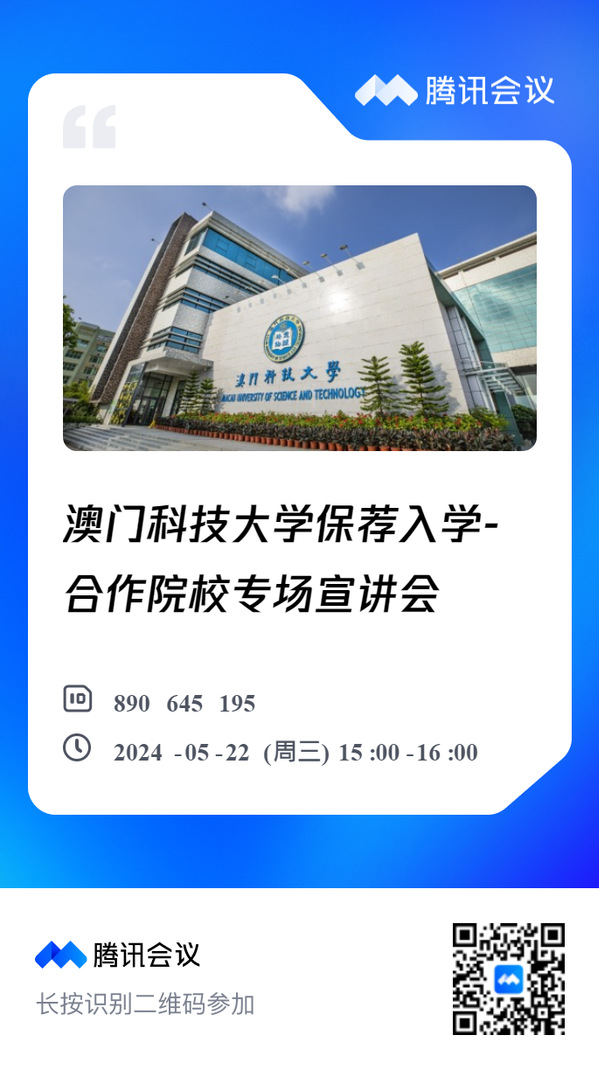 为了让糖心视频 学生能更了解澳科大的研究生课程,澳科大将于2024年5月22日(星期三)举办一场“澳门科技大学保荐入学-东大糖心视频 专场线上宣讲会”。此次宣讲会专为有意申请2025学年保荐入学的应届本科毕业生而设,旨在提供一个深入了解澳门科技大学研究生招生政策及申请流程的机会。
