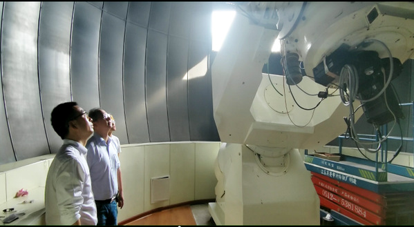 会后,在彭志欣秘书长的带领下,我院师生代表参观了南京大学左涤江天文台。首先进入一楼展厅,彭志欣秘书长科普了地球自转公转带来了月亮的阴晴圆缺、日偏食的形成、彗星产生的彗尾以及流星的形成原理、户猎座大星云、超新星的爆发、黑洞的秘密等天文知识。接着,一行人来到天文台广场,近距离接触天文望远镜,体验搭建望远镜并观察太阳日珥的活动,感受天文学科魅力的同时,也体会到南大人“仰望星空,脚踏实地”的天文情怀。