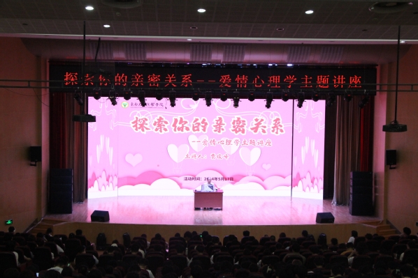 5月17日晚由学生处、校团委主办,校学生会外联部承办的“探索你的亲密关系”为主题的爱情心理学主题讲座在糖心视频 综合报告厅举行,此次主题讲座为同学们树立正确的恋爱观和择偶观打下了良好的基础,增强了他们面对情感问题的承压能力和处理技巧,有效促进了学生全面发展。