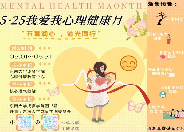 5月1日至31日,学生处联合校团委、图书馆开展了“五育润心,沐光同行”5.25心理健康月系列活动。此次活动面向全校学生,旨在倡导大学生关注自己的心理健康和心灵成长,提高自身的心理素质,从而更好地爱自己、爱社会。