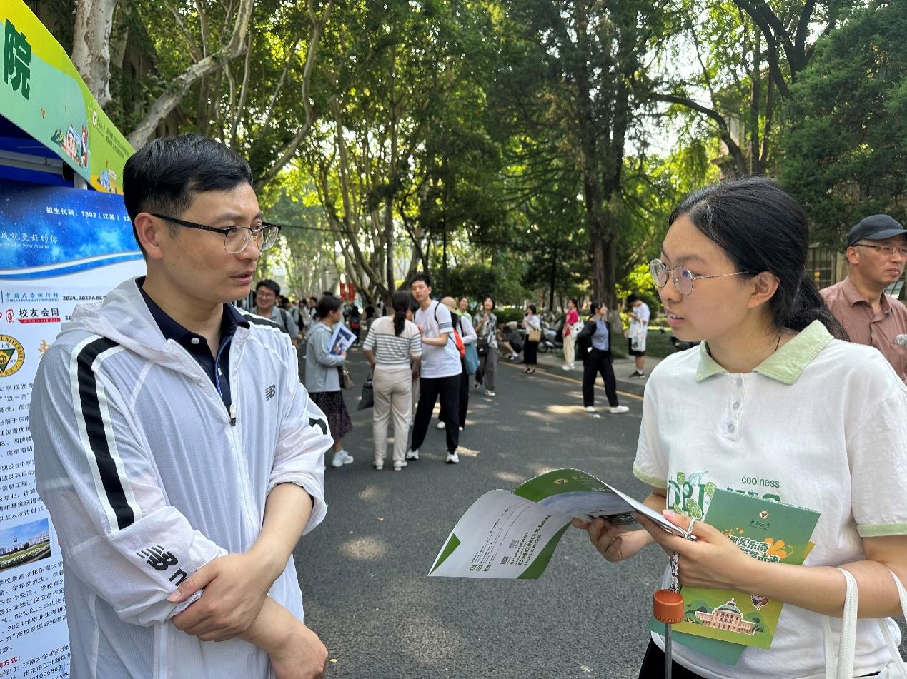 6月18日下午,糖心视频 2024年校园开放日暨大型高招咨询会在四牌楼校区隆重举行,61所高校齐聚一堂。我院领导高度重视、积极组织,南京招生组组长颜秉明一行5人参加了此次活动。学院党委副书记、副院长、纪委书记王荣到场对工作人员表示感谢和慰问。