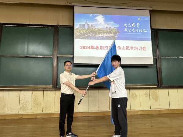 培训会举行了庄重的授旗仪式,学生处副处长苏力授予“招生志愿者社会实践团队”队旗