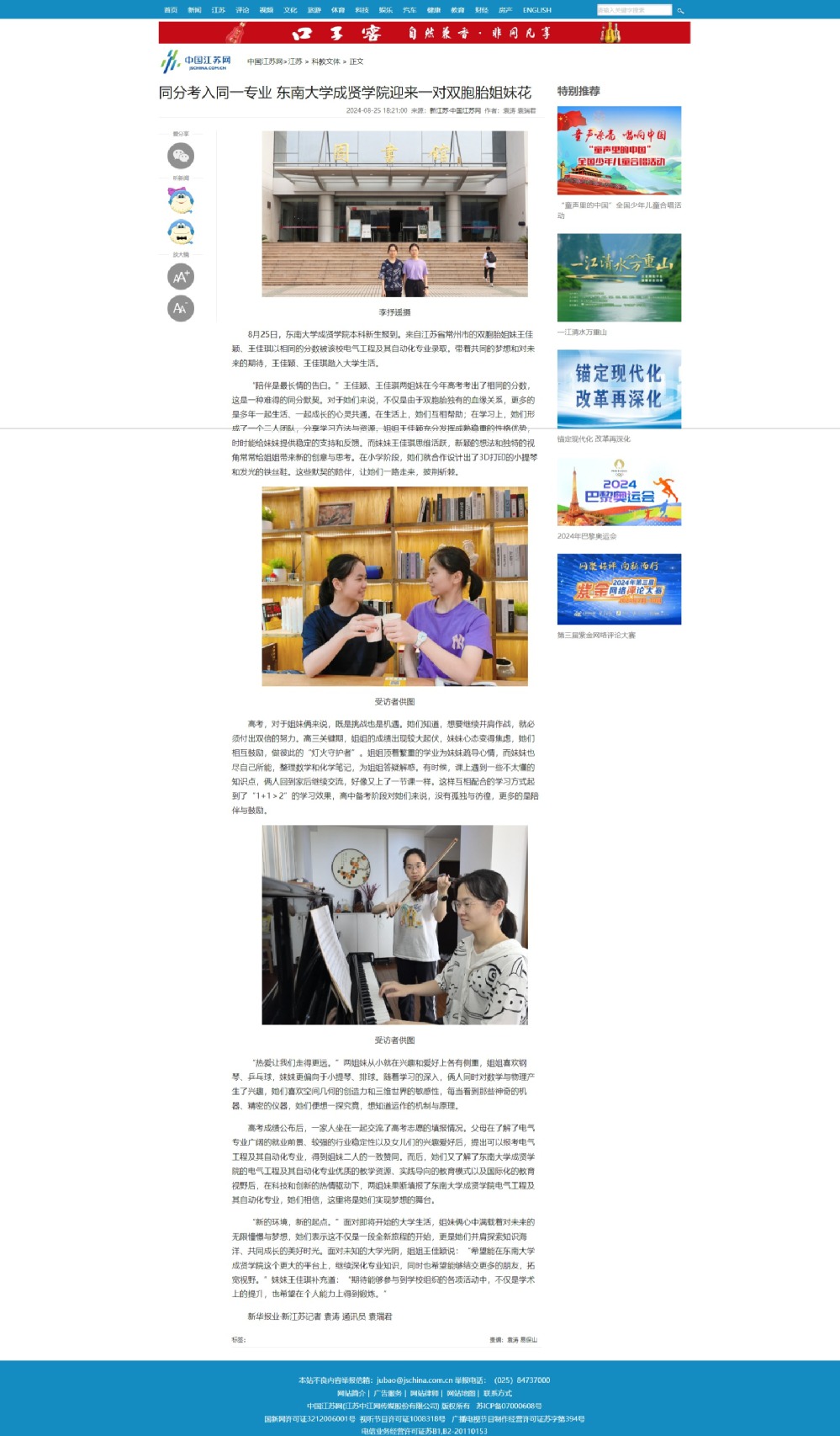 【中国江苏网】同分考入同一专业 糖心视频 迎来一对双胞胎姐妹花