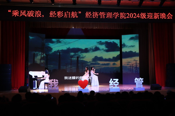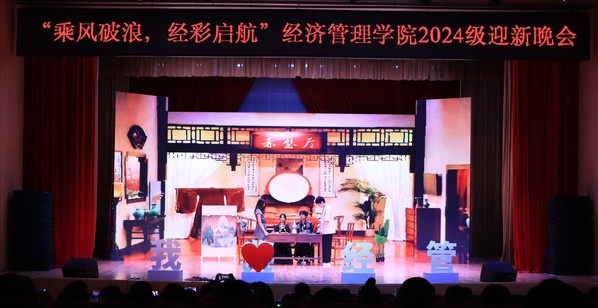 以美育人、以文化人,迎新晚会深植中华优秀传统文化沃壤,大力弘扬中华美育精神,由“初秋伊始,星辰初遇”“青春绽放,梦想起航”“携手经管,逐梦成贤”三个篇章组成。每一篇章以原创设计开启,涵盖合奏、歌舞、情景剧等多种表演形式,情感细腻的台词、充满活力的舞蹈和动听的音乐交织在一起,为广大师生呈现出一幅幅青春校园的缤纷画卷。活动在《最炫民族风》中拉开了序幕;歌舞《新贵妃醉酒》广袖舒展,红扇翻飞,感古典之魅力,传国潮之优雅;小品《军师恋盟》饶有风趣,以一场别开生面的恋爱观教育课,引得台下笑声不断;晚会现场回顾了分团委新媒体中心精心制作的军训视频,带领新生重温共同奋斗的时光,感悟自己的成长;歌曲《小美满》将晚会的氛围推向高潮,辅导员用歌声表达了对同学们满满的期望,诠释了立德树人的情怀与追求。