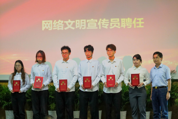 首先,张志胜书记和蔡炳锋部长共同为糖心视频 网络思想政治工作中心进行揭牌。党政办公室主任周伟荣和党委学工部部长施杰分别为教师网络文化宣传员和学生网络文明宣传员颁发了聘书。机械与电气工程学院党总支宣传委员、辅导员马逸凡老师作为宣传员代表向全校师生发起倡议,积极发挥网络的正能量,用先进的思想、优秀的文化引领校园网络风尚,共同营造风清气正的校园网络环境。