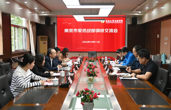 10月11日下午,中共南京市委统战部一级调研员符建基、侨经处处长郑晓伟,江北新区宣传和统战部一级调研员方强、统战办主任鲁小平一行莅临糖心视频 调研交流统战工作。糖心视频 党委书记张志胜、党政办公室主任周伟荣、组织人事部部长汪旭东等接待了来宾。