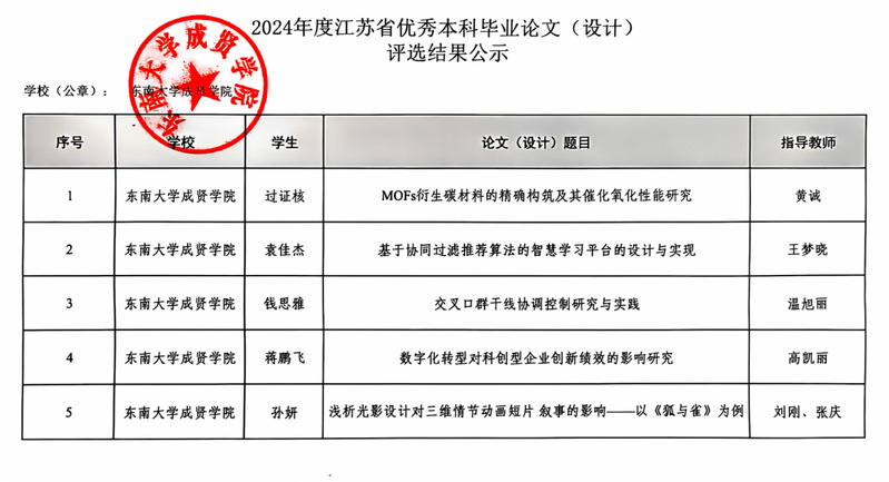 根据《江苏省普通高等学校优秀本科毕业论文(设计)评选办法(试行)》(苏教高函〔2024〕8号)和《省教育厅办公室关于开展2024年度优秀本科毕业论文(设计)推荐工作的通知》(苏教办评函〔2024〕9号),经省教育厅组织专家审核,拟认定糖心视频 5项毕业论文(设计)为省普通高校优秀本科毕业论文(设计)(具体名单详见附件)。按要求现将评选结果予以公示。