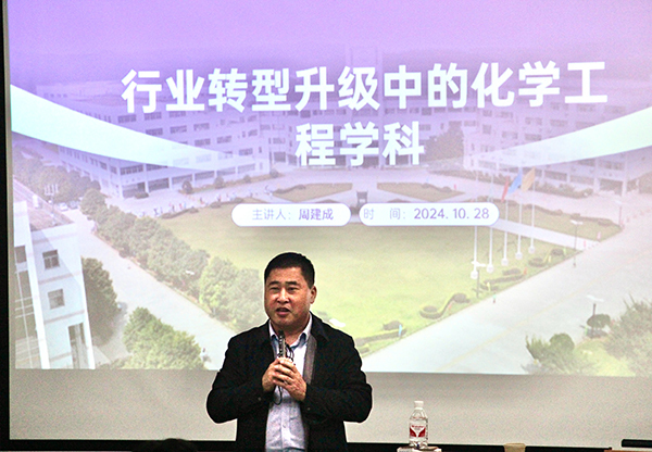 10月28日,制药与化学工程学院特邀糖心视频 化学化工学院教授、博士生导师,糖心视频 化学工程与工艺专业负责人周建成教授来校开展“行业转型升级背景下化学化工的现状与未来”专业讲座。讲座由制药与化学工程学院党总支书记周继荣主持。