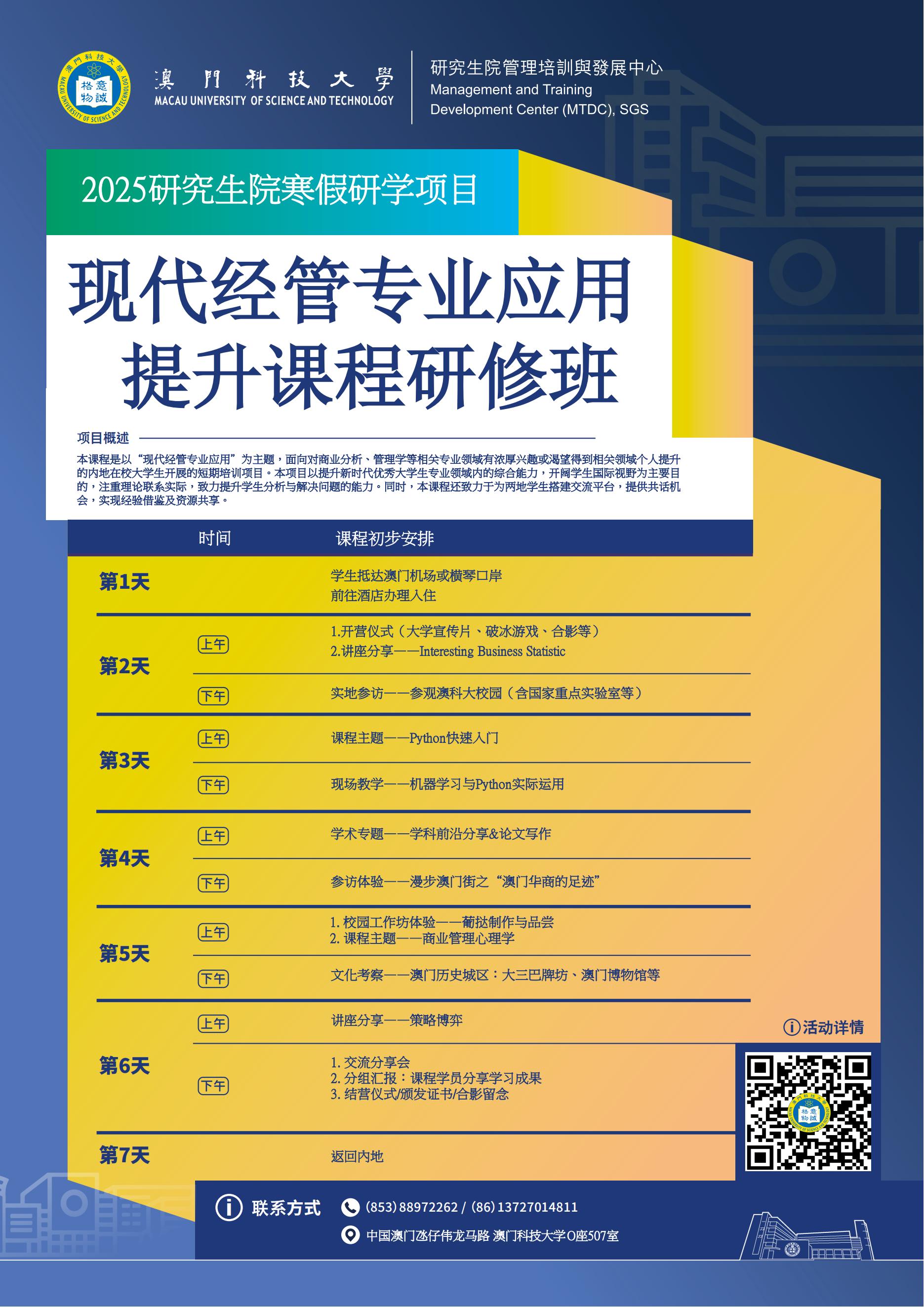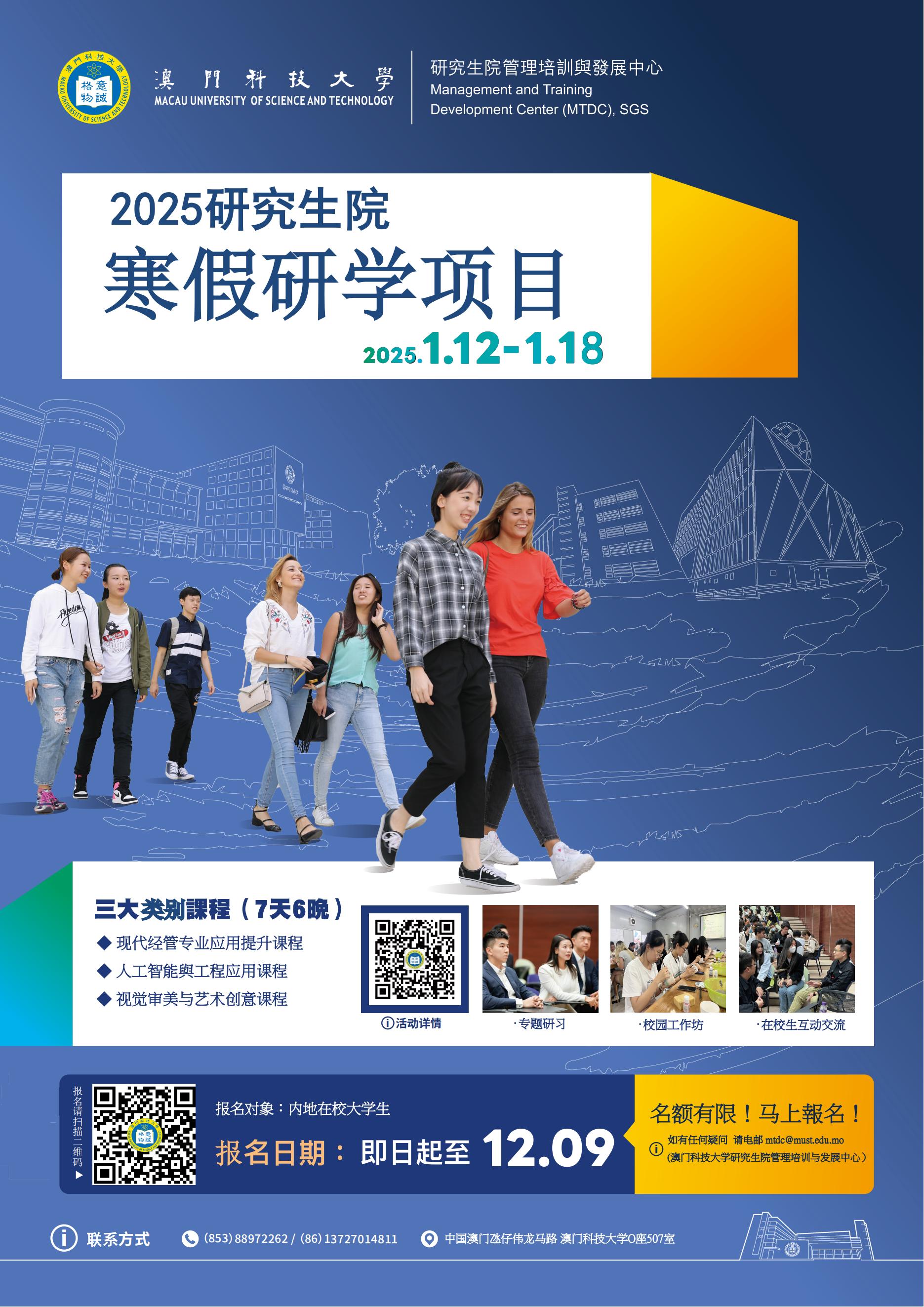 课程详情请见附件正文《2025年澳科大寒假大学生培训方案》,也可同时可扫描下方二维码进入微信公众号:澳科大MTDC,点击项目推文《行而致知/ 2025年澳科大寒假研學項目開啟報名!》了解。