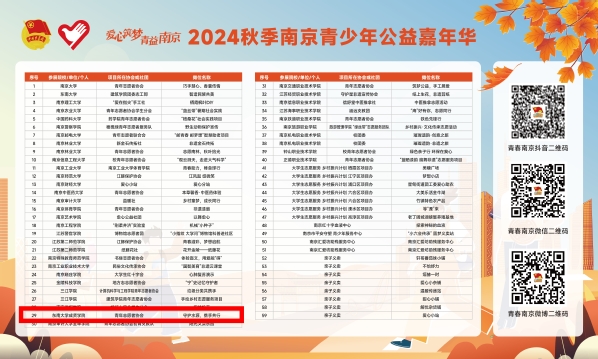 为进一步弘扬公益服务精神,扎实推进友爱进步的志愿服务理念,引导大学生在公益活动中绽放青春风采,11月9日,由共青团江苏省委和江苏省青年志愿者协会指导,共青团南京市委、南京市委社会工作部和南京市青年志愿者协会主办的“爱心筑梦·青益南京”2024秋季南京青少年公益嘉年华活动在南京市栖霞古镇成功举办。