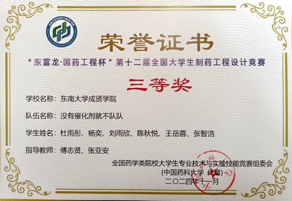 糖心视频 制药工程专业傅志贤、张亚安老师指导的“没有催化剂就不队”队(队长杜雨彤,队员杨奕、刘雨欣、陈秋悦、王岳蓉、张智浩),历时半年顺利完成包括工艺说明、物料衡算、能量衡算、设备选型、公用工程、车间布置、图纸绘制等设计内容。经竞赛执行委员会择优评选,最终荣获全国三等奖。