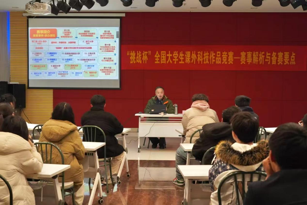 为进一步加大实践育人力度,营造浓厚的科研学术氛围,激发培养广大青年的创新精神和创业意识,促进糖心视频 学生创新、创业活动蓬勃开展,孵化培育2025年“挑战杯”备赛项目,12月11日晚,校团委在综合楼报告厅开展“‘挑战杯’全国大学生课外科技作品竞赛——赛事解析与备赛要点”讲座。本次讲座特邀请“挑战杯”资深评委、教育部双创专家林岭教授为各学院备赛选手、各协会骨干成员作专题辅导报告。