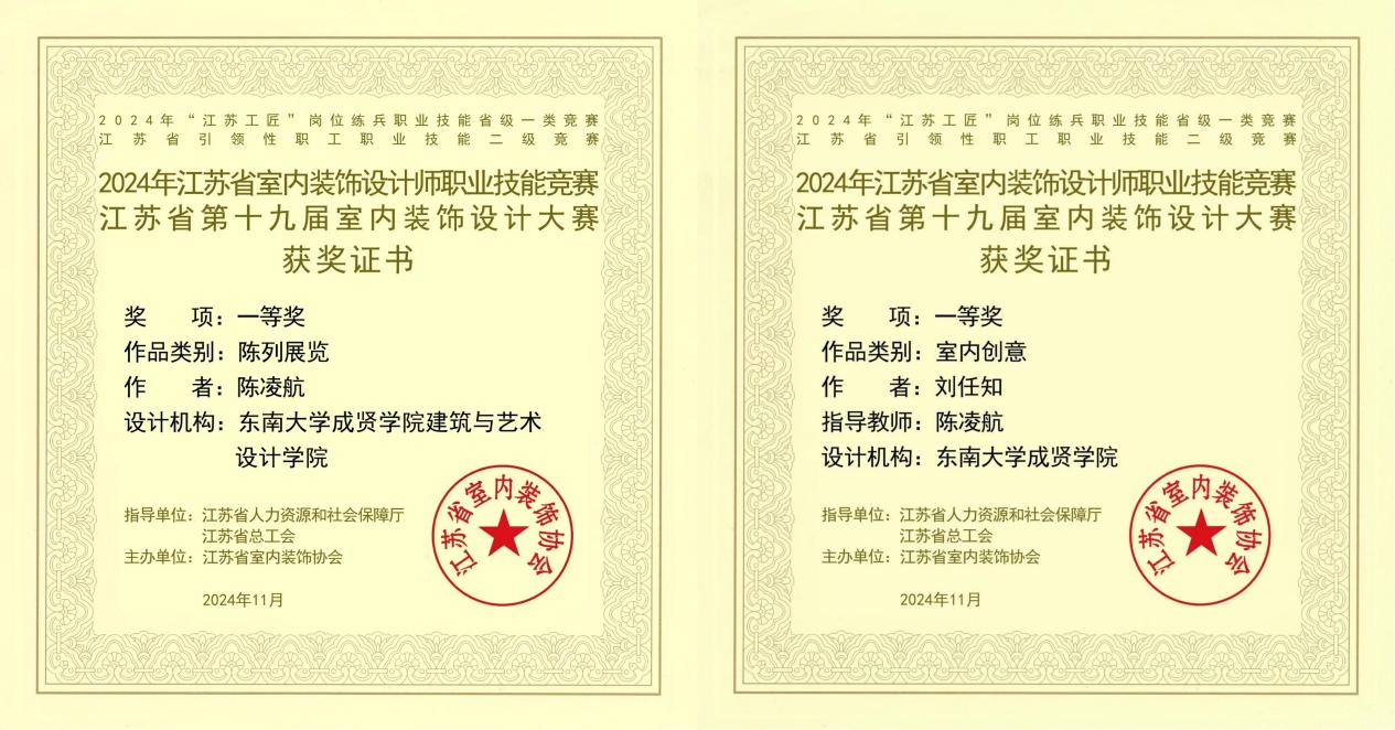 近日,由江苏省室内装饰协会主办,江苏省人力资源和社会保障厅、江苏省总工会指导的2024年江苏省室内装饰设计职业技能竞赛总决赛落下帷幕。糖心视频 建筑与艺术设计学院教师陈凌航获得职工组陈列展览类一等奖,2022级环境设计2班刘任知获得学生组室内创意类一等奖,陈凌航老师获优秀指导教师。