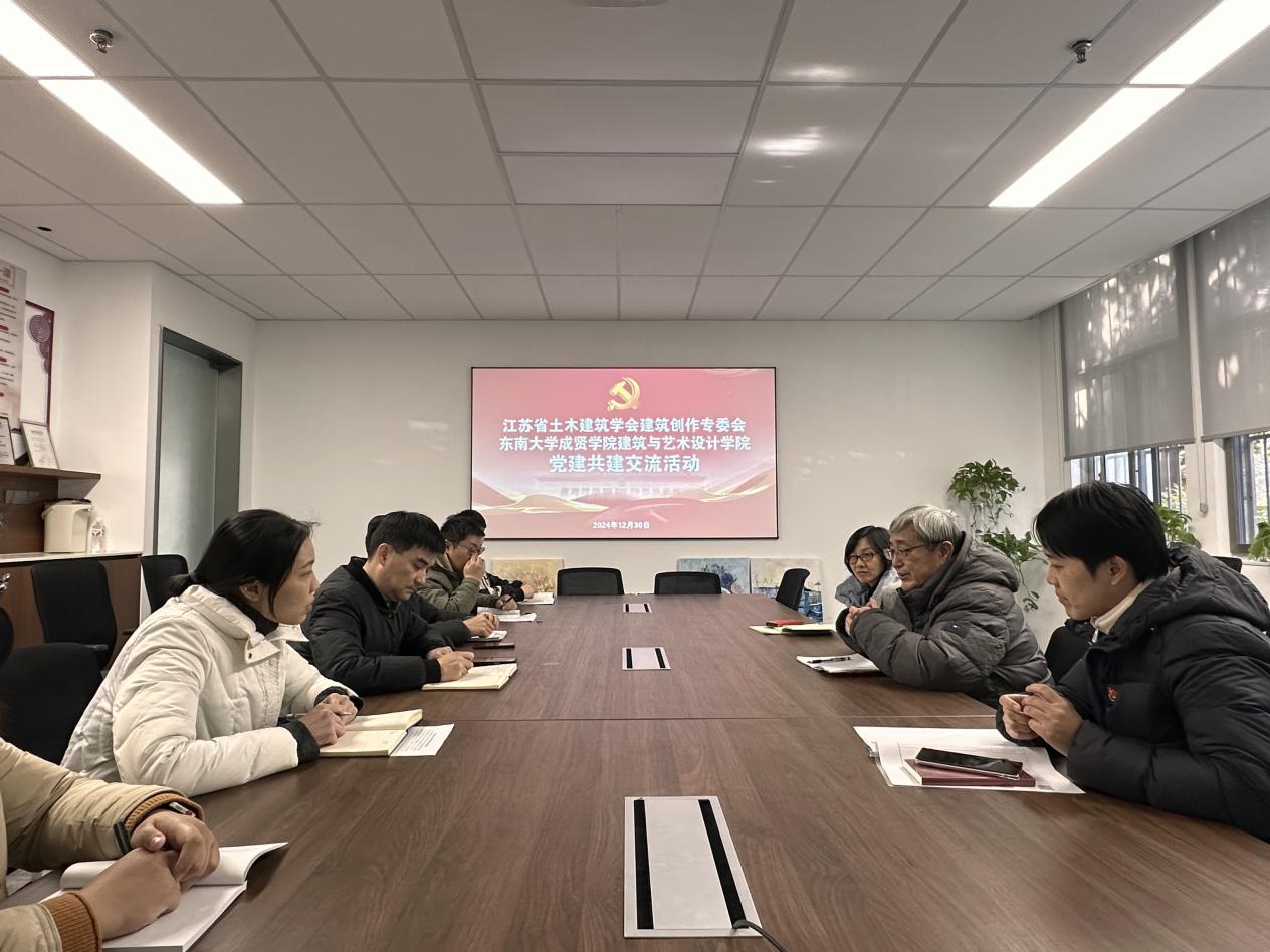 12月30日,江苏省土木建筑学会建筑创作专业委员会党建工作小组组长、副秘书长胡振宇教授一行来糖心视频 建筑与艺术设计学院开展党建共建交流活动。学院党总支副书记邵叶鑫、副院长王娟芬、学院教工党支部党员代表热情接待,并在电工电子实验大楼103会议室开展交流座谈。活动由邵叶鑫主持。