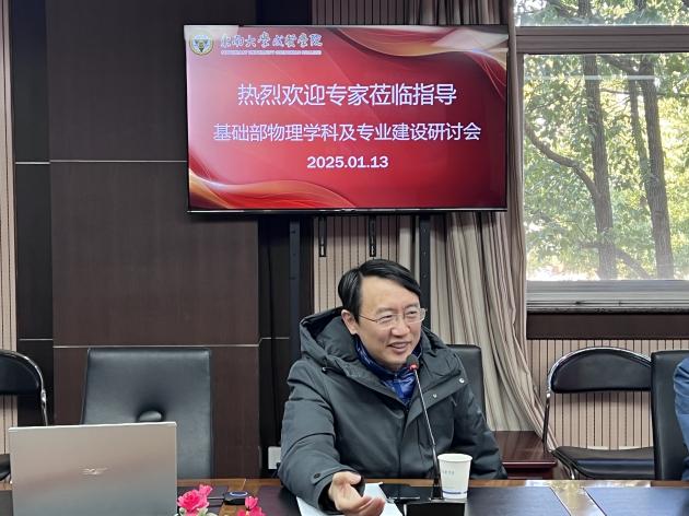 1月13日上午,基础部在真知馆207会议室成功举办了基础部物理学科及专业建设研讨会。本次会议邀请了南京大学王骏教授和糖心视频 杨永宏教授作为专家参与研讨,共同探讨基础部物理学科及专业建设的未来发展路径。糖心视频 常务副院长黄学良、副院长戴玉蓉、组织人事部部长汪旭东、基础部党政领导以及物理教研室全体教师参加会议,会议由基础部党总支书记董梅芳主持。