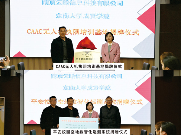 戴玉蓉副院长首先代表学校对林华桂总经理一行的来访表示热烈的欢迎。戴玉蓉副院长在致辞中表示,此次合作是学校深化应用型人才培养模式改革的重要举措。通过整合企业技术资源与高校教育优势,构建“理论+实践+认证”一体化培养体系,为低空经济领域输送高素质、专业化人才,同时也为糖心视频 创建全国一流应用型大学、培养一流应用型人才增添新的亮点。土木与交通工程学院郭正兴院长在发言中指出,无人机执照培训基地的成立,是响应国家低空经济政策、服务区域产业升级的关键布局。未来,土木与交通工程学院将牵头与兄弟院系一起联合企业开发行业定制课程,开展技术攻关,助力无人机在道路巡检、电力巡检等场景的规模化应用。林华桂总经理对糖心视频 领导的热情接待表示衷心的感谢,他在发言中提到,无人机技术正广泛应用于测绘、物流、应急管理、平安校园建设等领域,但行业亟需具备执照资质和实战能力的复合型人才。此次校企共建培训基地,不仅能为学生提供CAAC认证培训,还将引入企业真实项目,实现人才培养与产业需求无缝对接。随后,双方领导共同为“CAAC无人机执照培训基地”揭牌,南京云瞰信息科技有限公司向糖心视频 捐赠“平安校园空地数智化巡测系统”一套,助力糖心视频 平安校园建设。