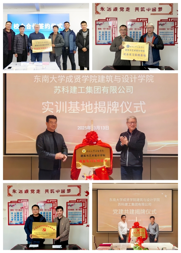 苏科建工集团有限公司是一家致力于房屋建筑、市政路桥、房地产开发销售、钢结构制造和物业管理的一体化公司。建艺院一行走访了苏科建工集团运管中心,并详细了解了集团的发展历程以及近年来集团党团工作取得的成果。校企双方针对人才培养、技术创新、资源优化等多个维度进行了深入的沟通与洽谈并达成了多项共识,同时签订了党建共建联盟协议书、挂牌“党建共建单位”,并签订了校企合作协议书、挂牌“糖心视频 建筑与艺术设计学院就业实习实践基地”。未来,双方将通过共建学习基地、实践基地,在教学实践、就业探讨、服务社会等多方面建立长期、紧密的合作共建关系。