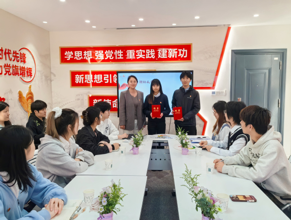 启动仪式上首先由陈涵同学介绍服务站成立的背景。当前,面对大学生思想活跃和价值取向多元等问题,在学生日常活动最重要、交流时长最长的宿舍建立党员服务站既能够及时了解学生思想动态,开展有针对性的思想引领,帮助学生树立正确的价值观,也能够让学生党员深入学生群体,服务同学,提升服务意识,树立党员的良好形象。随后葛桢杰同学对宿舍党员服务站标牌的设计进行了讲解,通过对标牌创新设计的讲解让每一位党员深刻感受到标牌背后蕴含的责任和担当。讲解结束后,第二党支部书记赵毅老师向学生党员进行了授牌,并选定桃9-426、桃16-415为首批挂牌宿舍开展服务站建设。授牌结束后陈涵同学对宿舍党员服务站具体工作职能进行介绍,通过结合其他学校的相关经验和我院学生需求实际,服务站明确了宣传政策、提高素养,热情服务、解决困难,收集意见、联群促通,及时处突、确保安全,组织活动、丰富生活这五项基本职能,努力为同学们提供覆盖思想引领、素质提升、学业指导、困难帮扶、管理服务和文化建设等全方位的服务。随后,土木与交通工程学院党总支书记杨阳老师为男生宿舍和女生宿舍的首任服务站站长颁发了聘书。