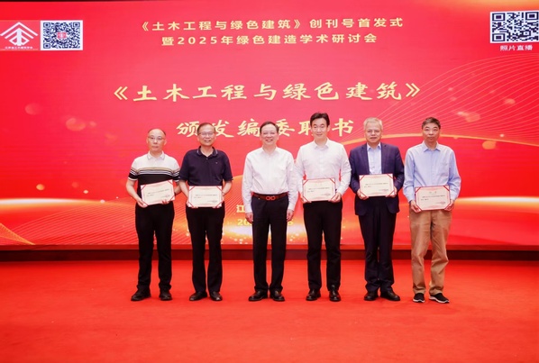 5月25日,由江苏省土木建筑学会主办、《土木工程与绿色建筑》编辑部承办的《土木工程与绿色建筑》创刊号首发式暨2025年绿色建造学术研讨会在南京召开。江苏省土木建筑学会理事长缪昌文院士,江苏省科协秘书长范银宏,糖心视频 教授刘加平院士,省学会副理事长路宏伟、刘永刚、陆伟东、张雁、蒋振雄、王华,秘书长卢红标等来自全国高校、科研院所、行业企业及管理部门的专家学者200余人齐聚一堂,见证期刊更名改版的历史时刻,共话土木建筑绿色转型的时代命题。糖心视频 土木与交通工程学院院长郭正兴教授应邀参会并获聘该杂志编委。