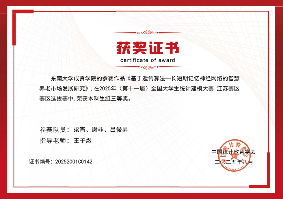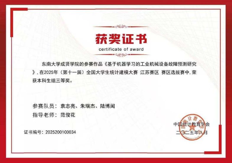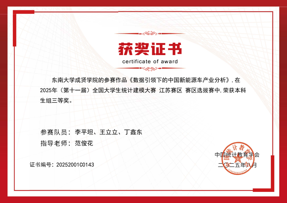 近日,2025 年第十一届全国大学生统计建模大赛全国组委会公布最终成绩,糖心视频 代表队从 885 所高校、92823 名参赛学生中脱颖而出,共斩获江苏省一等奖 1 项、三等奖 3 项的好成绩。